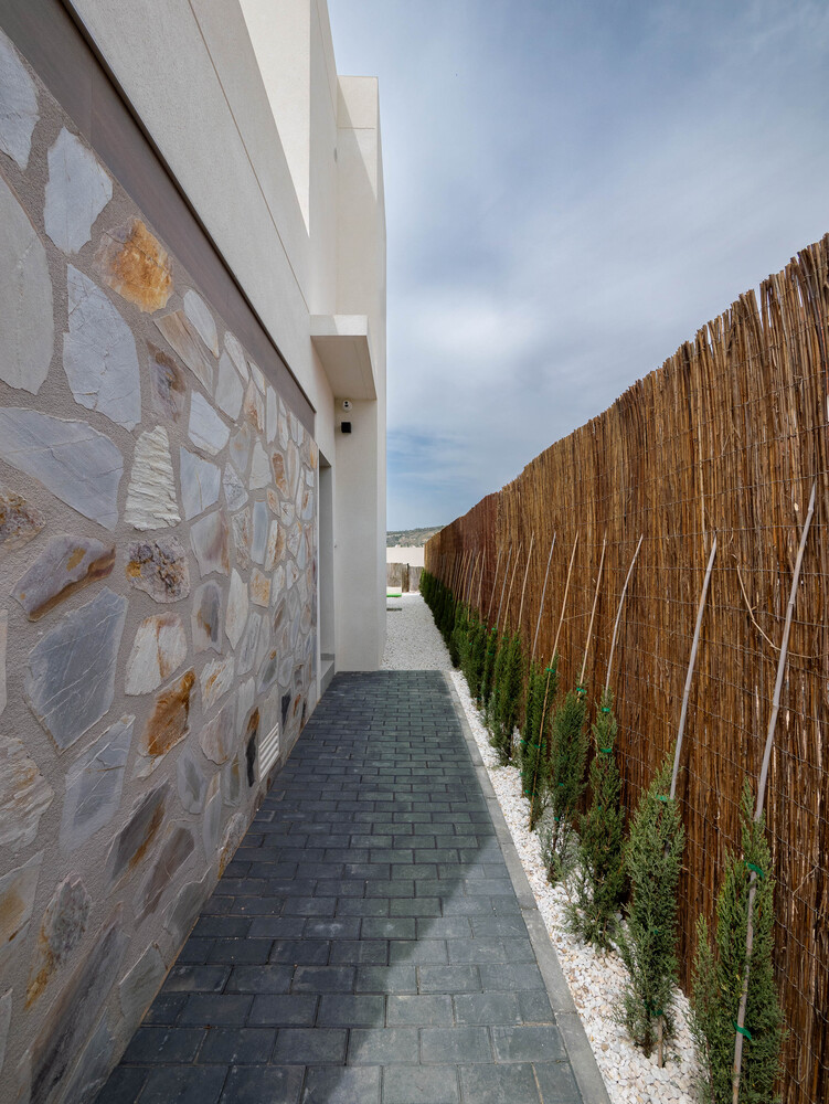 De villa’s beschikken over drie slaapkamers: twee comfortabele slaapkamers met een gedeelde badkamer op de begane grond, en een luxe master bedroom met en-suite badkamer op de eerste verdieping. Vanuit deze master suite heeft u direct toegang tot een prachtig solarium van 30 m² – de ideale plek om te ontspannen en te genieten van het uitzicht. De fraai aangelegde tuin is volledig voorzien van beplanting en een automatisch irrigatiesysteem, zodat u zonder zorgen van uw nieuwe woning kunt genieten.